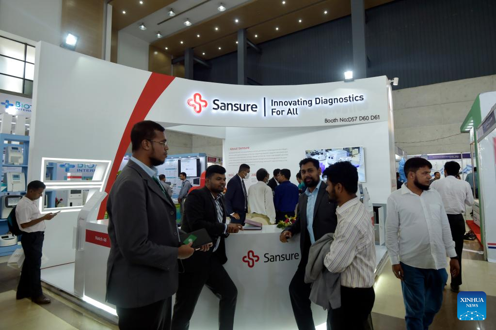 Visitors talk in front of an exhibition booth of Sansure Biotech Inc. during the "Meditex Bangladesh 2022" expo in Dhaka, Bangladesh, Oct. 13, 2022. (Xinhua)