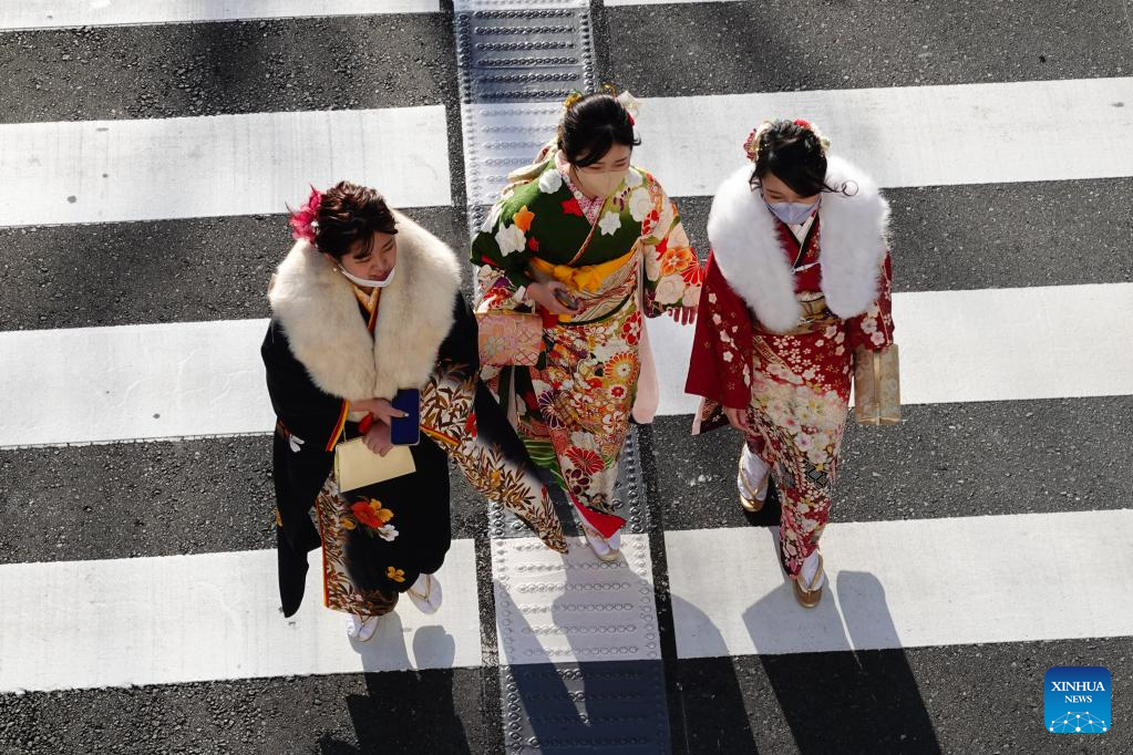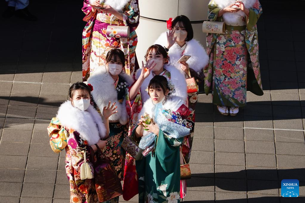 Girls in kimonos take part in a Coming of Age Day ceremony in Yokohama, Japan, Jan. 9, 2023. Coming of Age Day is a public holiday in Japan held annually on the second Monday of January. With the enactment of the revised Civil Code last April, the age of adulthood was lowered to 18 from 20. (Xinhua/Zhang Xiaoyu)