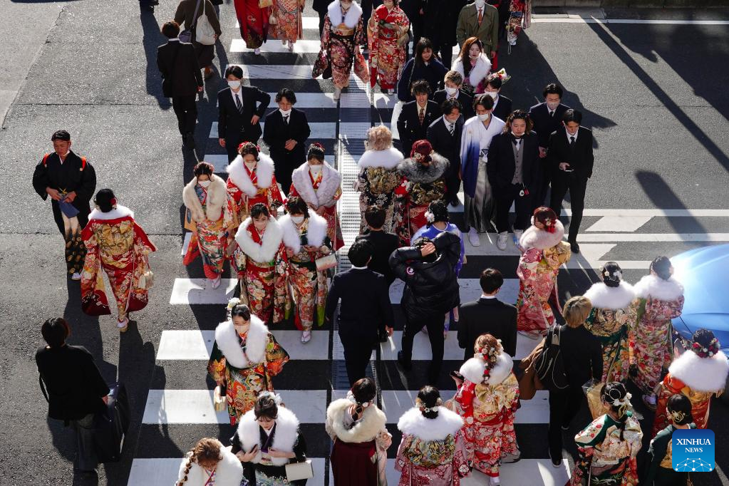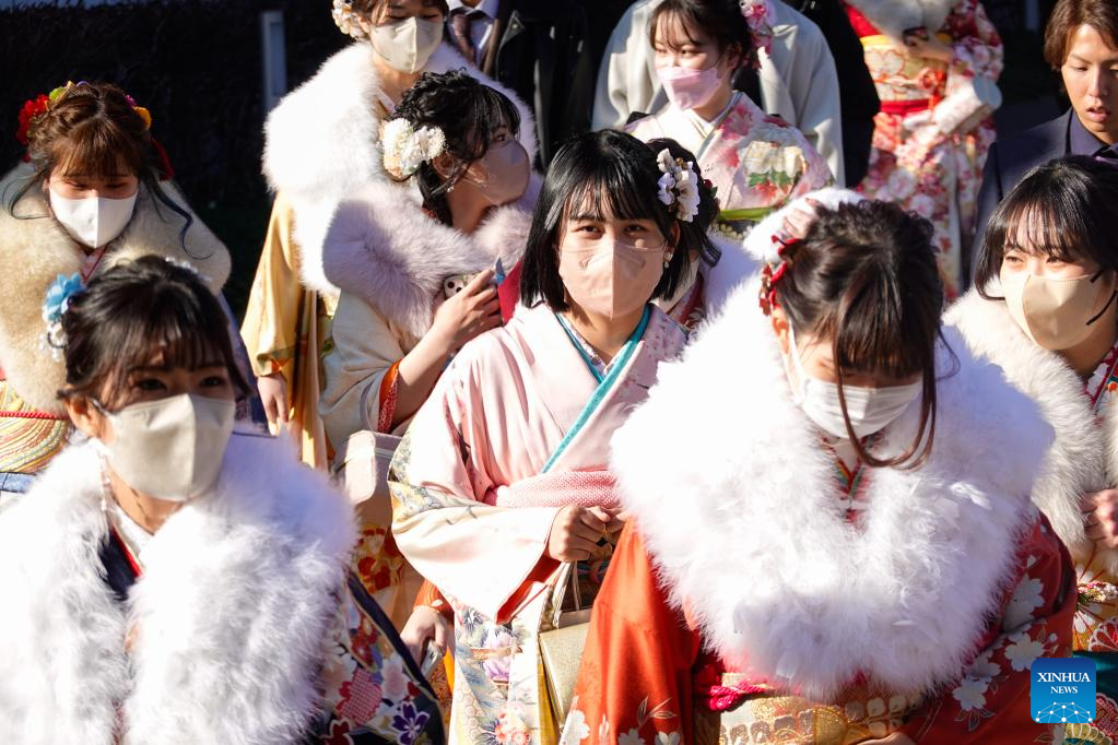 Teenagers take part in a Coming of Age Day ceremony in Yokohama, Japan, Jan. 9, 2023. Coming of Age Day is a public holiday in Japan held annually on the second Monday of January. With the enactment of the revised Civil Code last April, the age of adulthood was lowered to 18 from 20. (Xinhua/Zhang Xiaoyu)