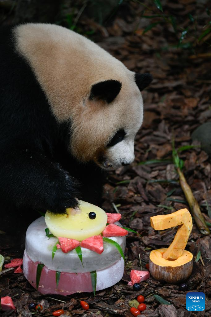 Giant panda Mei Lan eats an ice cake at Chengdu Research Base of Giant Panda Breeding in Chengdu, southwest China's Sichuan Province, May 29, 2023. Giant panda Mei Lan celebrated its 7th birthday at the Chengdu Research Base of Giant Panda Breeding on Monday. (Xinhua/Xu Bingjie)