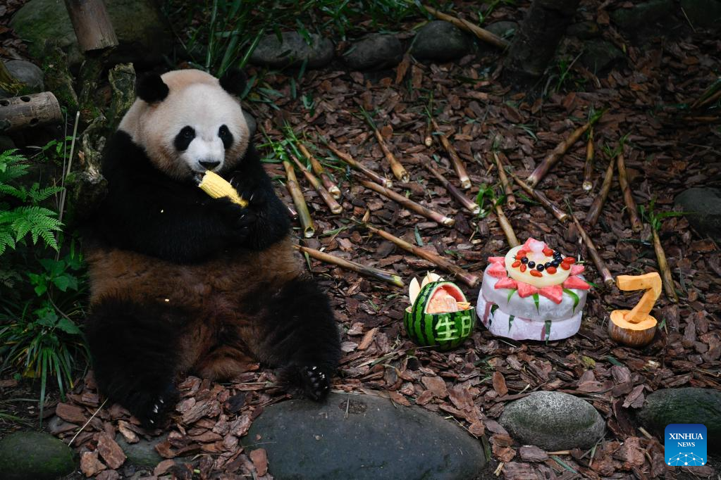 This photo taken on May 29, 2023 shows giant panda Mei Lan at Chengdu Research Base of Giant Panda Breeding in Chengdu, southwest China's Sichuan Province. Giant panda Mei Lan celebrated its 7th birthday at the Chengdu Research Base of Giant Panda Breeding on Monday. (Xinhua/Xu Bingjie)