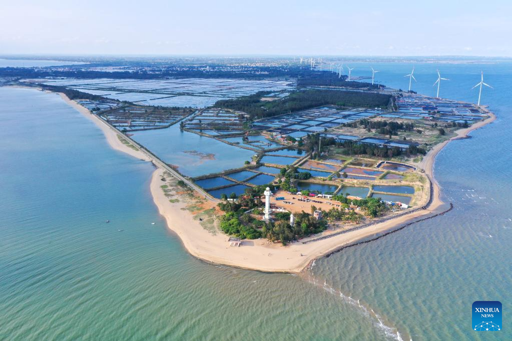 This aerial photo taken on May 27, 2023 shows the view of Deng Lou Corner in Jiaowei Township of Xuwen County, Zhanjiang City, south China's Guangdong Province. The Deng Lou Corner is named after the lighthouse situated on the ground and the pointed shape of the ground into the sea. Bordering the South China Sea on the east and the Beibu Gulf on the west and facing the Hainan Island to the south across the Qiongzhou Strait, Zhanjiang City in south China's Guangdong Province has the largest area of mangrove forest across the country and is an important base of aquatic products. In recent years, the city has put great emphasis on the development of green industries and marine economy. (Xinhua/Deng Hua)
