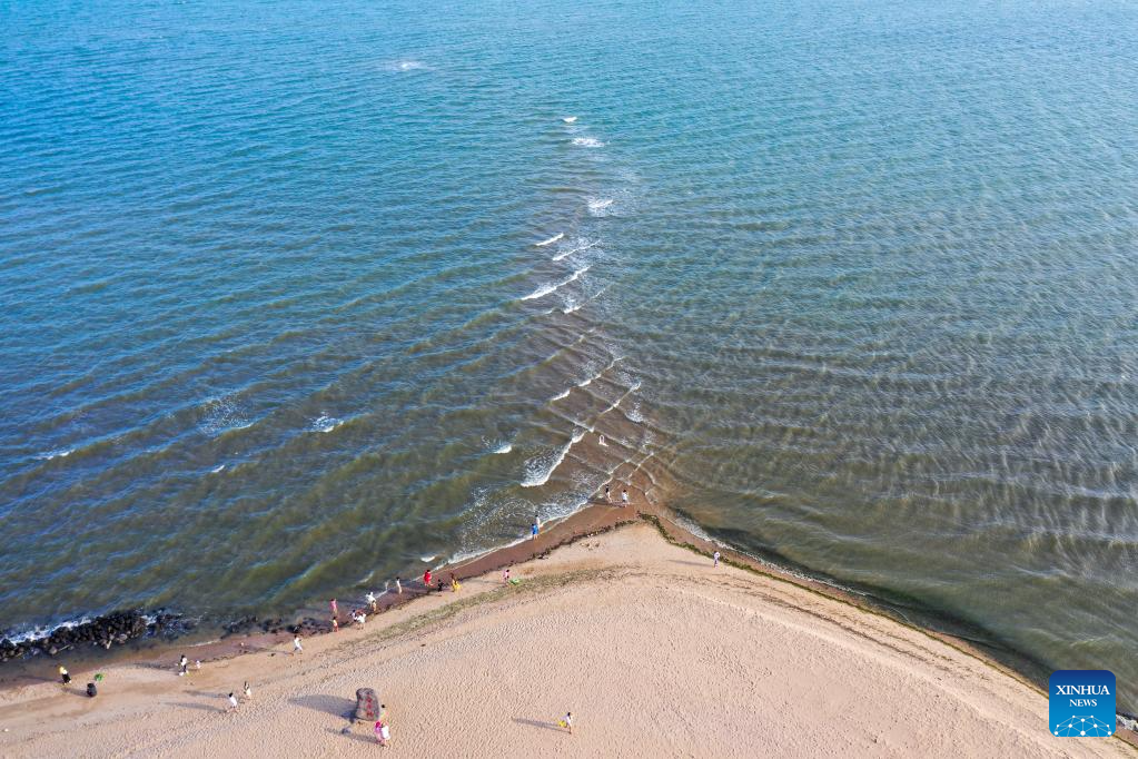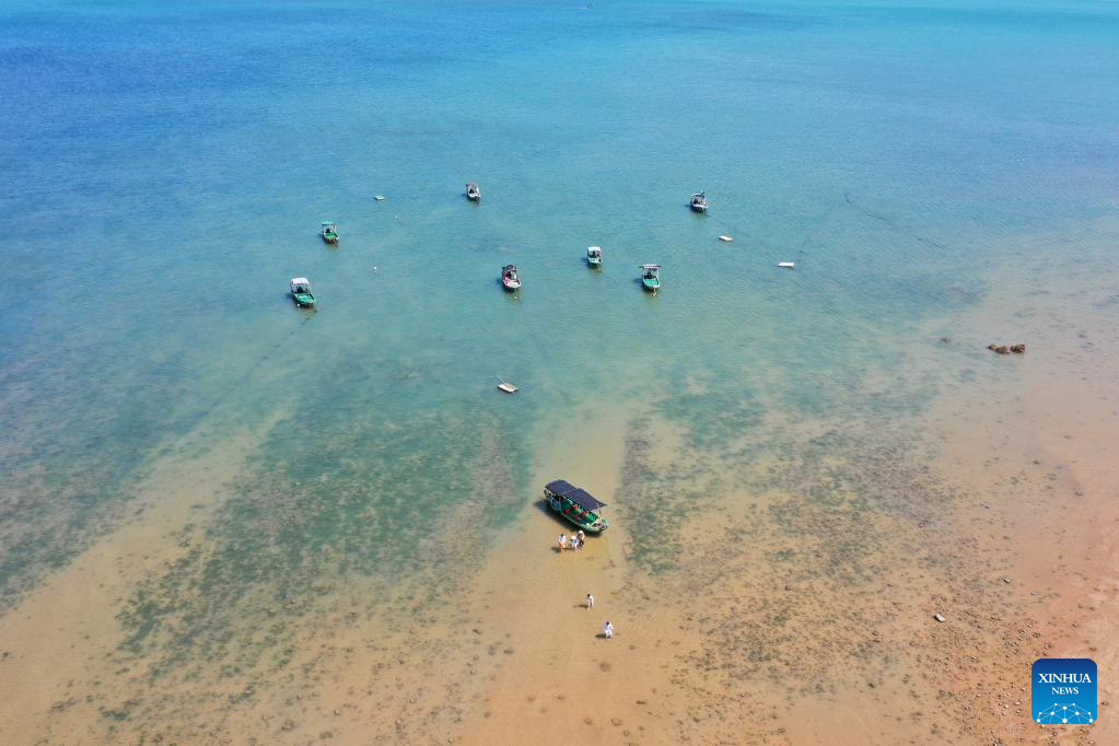 This aerial photo taken on May 28, 2023 shows tourists having fun in Jiaowei Township of Xuwen County, Zhanjiang City, south China's Guangdong Province. Bordering the South China Sea on the east and the Beibu Gulf on the west and facing the Hainan Island to the south across the Qiongzhou Strait, Zhanjiang City in south China's Guangdong Province has the largest area of mangrove forest across the country and is an important base of aquatic products. In recent years, the city has put great emphasis on the development of green industries and marine economy. (Xinhua/Liang Xu)