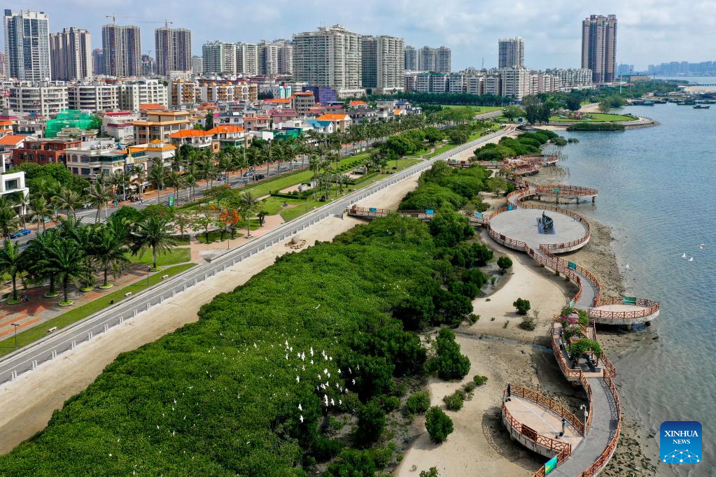 This aerial photo taken on May 25, 2023 shows egrets resting in the mangrove forest in Xiashan District of Zhanjiang City, south China's Guangdong Province. Bordering the South China Sea on the east and the Beibu Gulf on the west and facing the Hainan Island to the south across the Qiongzhou Strait, Zhanjiang City in south China's Guangdong Province has the largest area of mangrove forest across the country and is an important base of aquatic products. In recent years, the city has put great emphasis on the development of green industries and marine economy. (Xinhua/Liu Dawei)