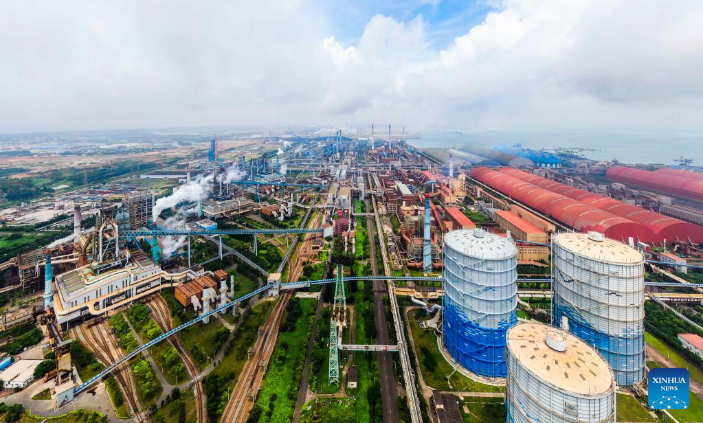 This aerial photo taken on May 25, 2023 shows the factory of Baosteel Zhanjiang Iron & Steel Co., Ltd. in Donghai Island of Zhanjiang City, south China's Guangdong Province. Bordering the South China Sea on the east and the Beibu Gulf on the west and facing the Hainan Island to the south across the Qiongzhou Strait, Zhanjiang City in south China's Guangdong Province has the largest area of mangrove forest across the country and is an important base of aquatic products. In recent years, the city has put great emphasis on the development of green industries and marine economy. (Xinhua/Deng Hua)