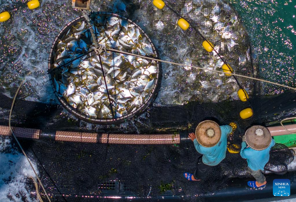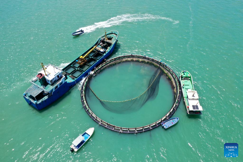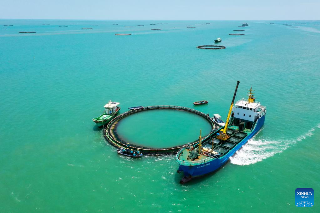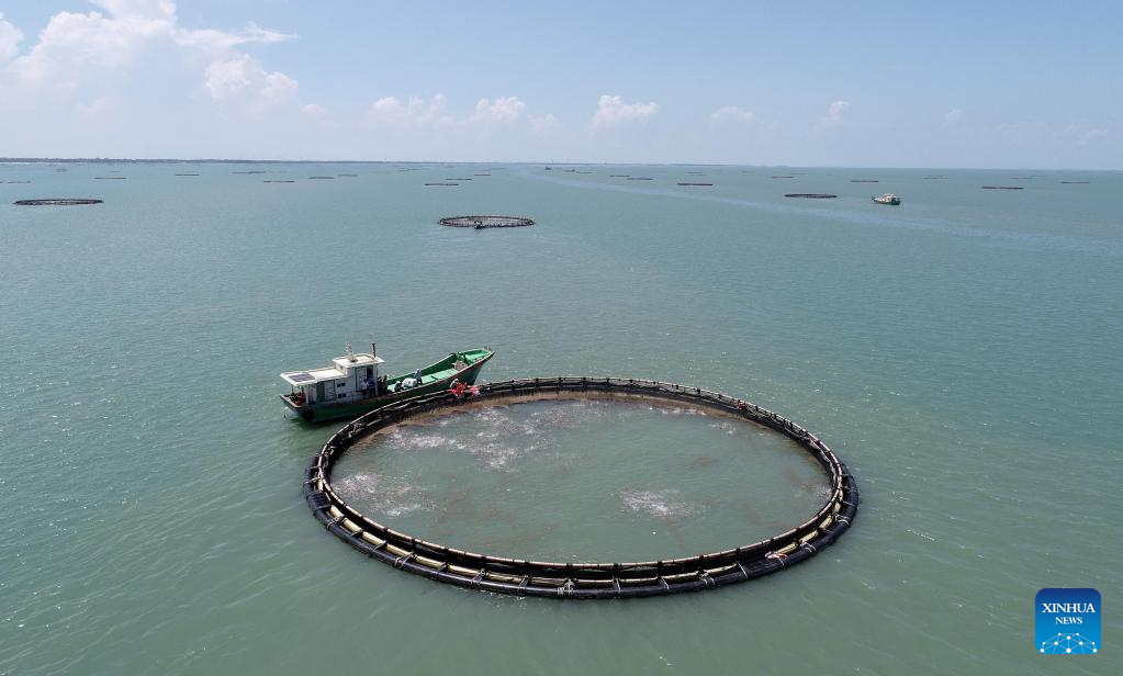 This aerial photo taken on May 27, 2023 shows fishery workers capturing golden pomfrets from deep sea net cages in Xilian Township of Xuwen County, Zhanjiang City, south China's Guangdong Province. Bordering the South China Sea on the east and the Beibu Gulf on the west and facing the Hainan Island to the south across the Qiongzhou Strait, Zhanjiang City in south China's Guangdong Province has the largest area of mangrove forest across the country and is an important base of aquatic products. In recent years, the city has put great emphasis on the development of green industries and marine economy. (Xinhua/Mao Siqian)