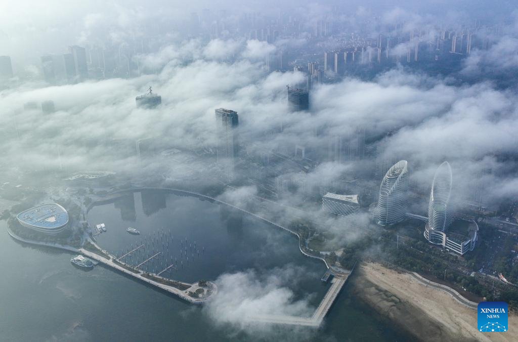 This aerial photo taken on Jan. 13, 2023 shows the urban areas enveloped by mist of Zhanjiang City in south China's Guangdong Province. Bordering the South China Sea on the east and the Beibu Gulf on the west and facing the Hainan Island to the south across the Qiongzhou Strait, Zhanjiang City in south China's Guangdong Province has the largest area of mangrove forest across the country and is an important base of aquatic products. In recent years, the city has put great emphasis on the development of green industries and marine economy. (Photo by Lang Shuchen/Xinhua)
