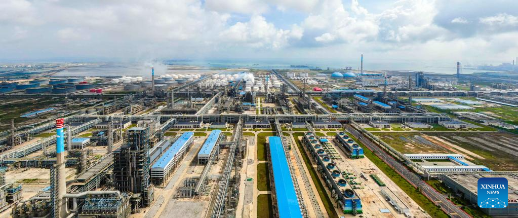 This aerial photo taken on May 25, 2023 shows the factory of Zhongke (Guangdong) Refinery & Petrochemical Company Limited in Donghai Island of Zhanjiang City, south China's Guangdong Province. Bordering the South China Sea on the east and the Beibu Gulf on the west and facing the Hainan Island to the south across the Qiongzhou Strait, Zhanjiang City in south China's Guangdong Province has the largest area of mangrove forest across the country and is an important base of aquatic products. In recent years, the city has put great emphasis on the development of green industries and marine economy. (Xinhua/Deng Hua)