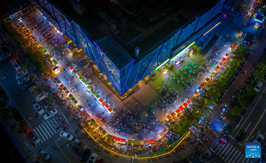 This aerial photo taken on May 25, 2023 shows a night market in Zhanjiang City, south China's Guangdong Province. Bordering the South China Sea on the east and the Beibu Gulf on the west and facing the Hainan Island to the south across the Qiongzhou Strait, Zhanjiang City in south China's Guangdong Province has the largest area of mangrove forest across the country and is an important base of aquatic products. In recent years, the city has put great emphasis on the development of green industries and marine economy. (Xinhua/Mao Siqian)