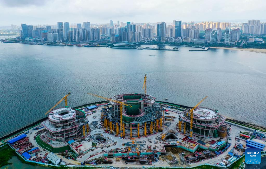 This aerial photo taken on May 26, 2023 shows the Zhangjiang Cultural Center under construction in Zhanjiang City, south China's Guangdong Province. Bordering the South China Sea on the east and the Beibu Gulf on the west and facing the Hainan Island to the south across the Qiongzhou Strait, Zhanjiang City in south China's Guangdong Province has the largest area of mangrove forest across the country and is an important base of aquatic products. In recent years, the city has put great emphasis on the development of green industries and marine economy. (Xinhua/Liu Dawei)