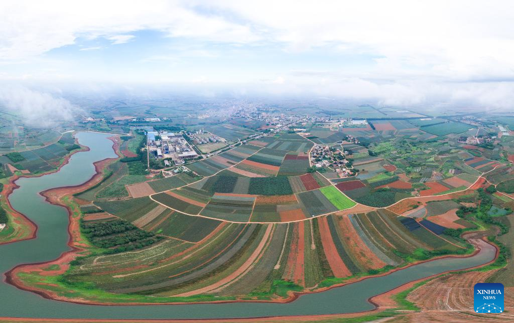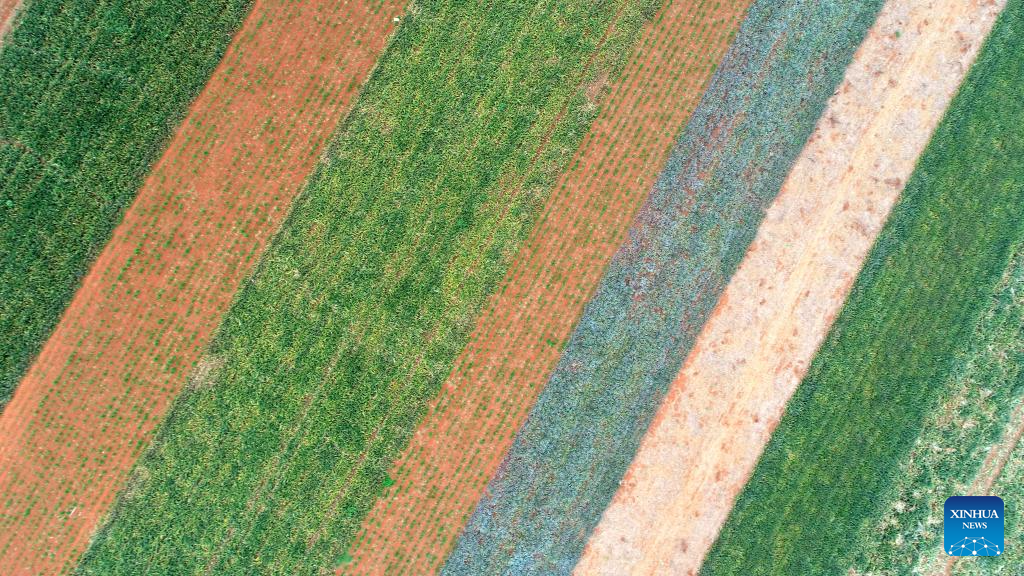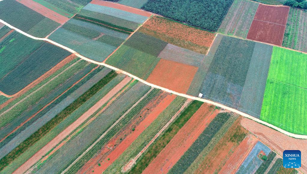 This aerial photo taken on May 26, 2023 shows the fields which are mainly planted with pineapples in Qujie Township of Xuwen County, Zhanjiang City, south China's Guangdong Province. Bordering the South China Sea on the east and the Beibu Gulf on the west and facing the Hainan Island to the south across the Qiongzhou Strait, Zhanjiang City in south China's Guangdong Province has the largest area of mangrove forest across the country and is an important base of aquatic products. In recent years, the city has put great emphasis on the development of green industries and marine economy. (Xinhua/Lu Hanxin)