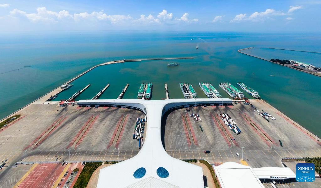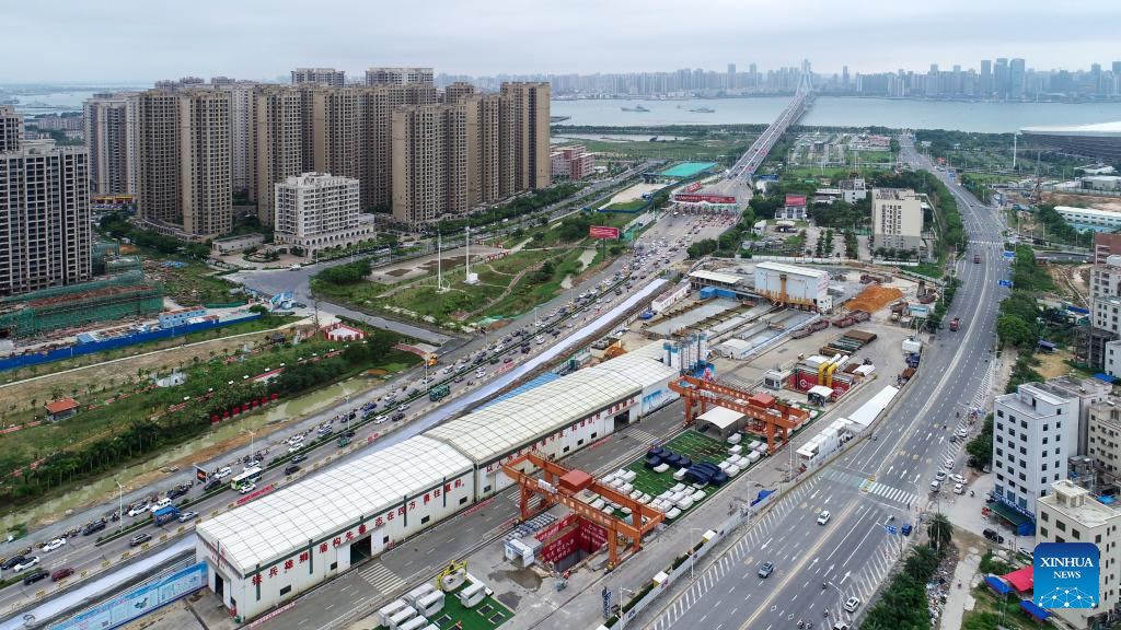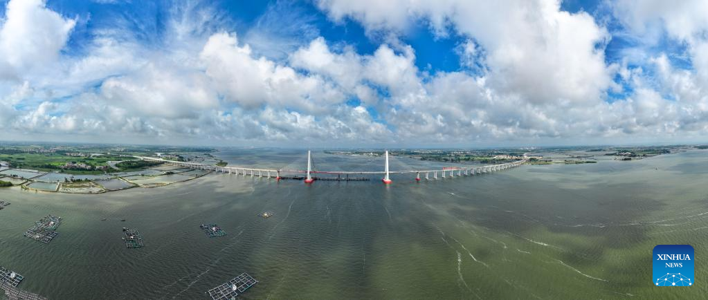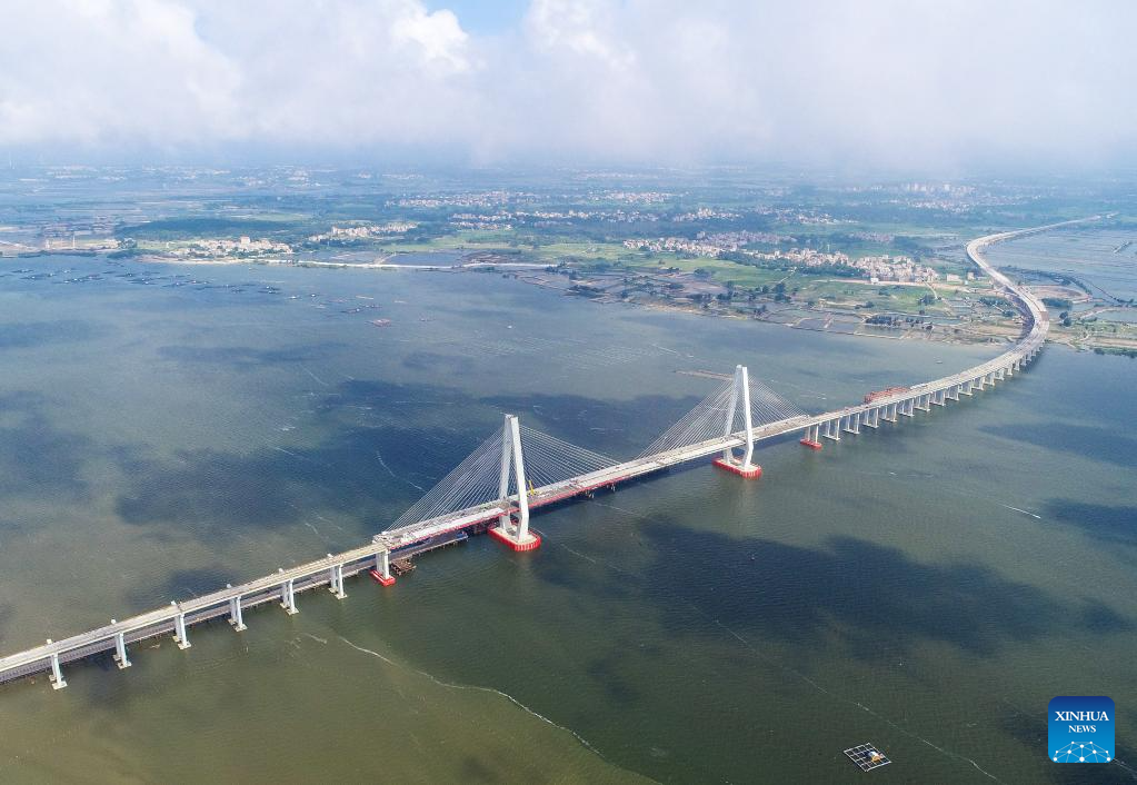 This aerial photo taken on May 24, 2023 shows part of the Zhanjiang Bay undersea tunnel of the Guangzhou-Zhanjiang Railway in Zhanjiang City, south China's Guangdong Province. Bordering the South China Sea on the east and the Beibu Gulf on the west and facing the Hainan Island to the south across the Qiongzhou Strait, Zhanjiang City in south China's Guangdong Province has the largest area of mangrove forest across the country and is an important base of aquatic products. In recent years, the city has put great emphasis on the development of green industries and marine economy. (Xinhua/Liang Xu)