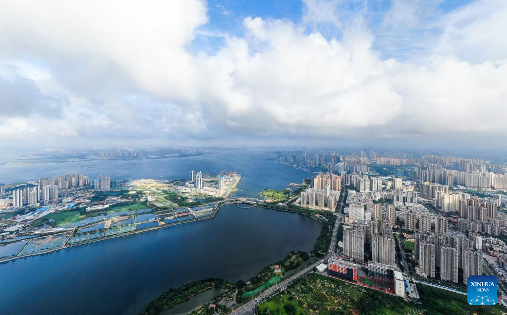 This aerial photo taken on May 25, 2023 shows the view of urban areas of Zhanjiang City in south China's Guangdong Province. Bordering the South China Sea on the east and the Beibu Gulf on the west and facing the Hainan Island to the south across the Qiongzhou Strait, Zhanjiang City in south China's Guangdong Province has the largest area of mangrove forest across the country and is an important base of aquatic products. In recent years, the city has put great emphasis on the development of green industries and marine economy. (Xinhua/Deng Hua)