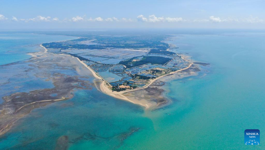 This aerial photo taken on Oct. 17, 2022 shows the view of Jinsha Bay in Zhanjiang City, south China's Guangdong Province. Bordering the South China Sea on the east and the Beibu Gulf on the west and facing the Hainan Island to the south across the Qiongzhou Strait, Zhanjiang City in south China's Guangdong Province has the largest area of mangrove forest across the country and is an important base of aquatic products. In recent years, the city has put great emphasis on the development of green industries and marine economy. (Photo by Lang Shuchen/Xinhua)