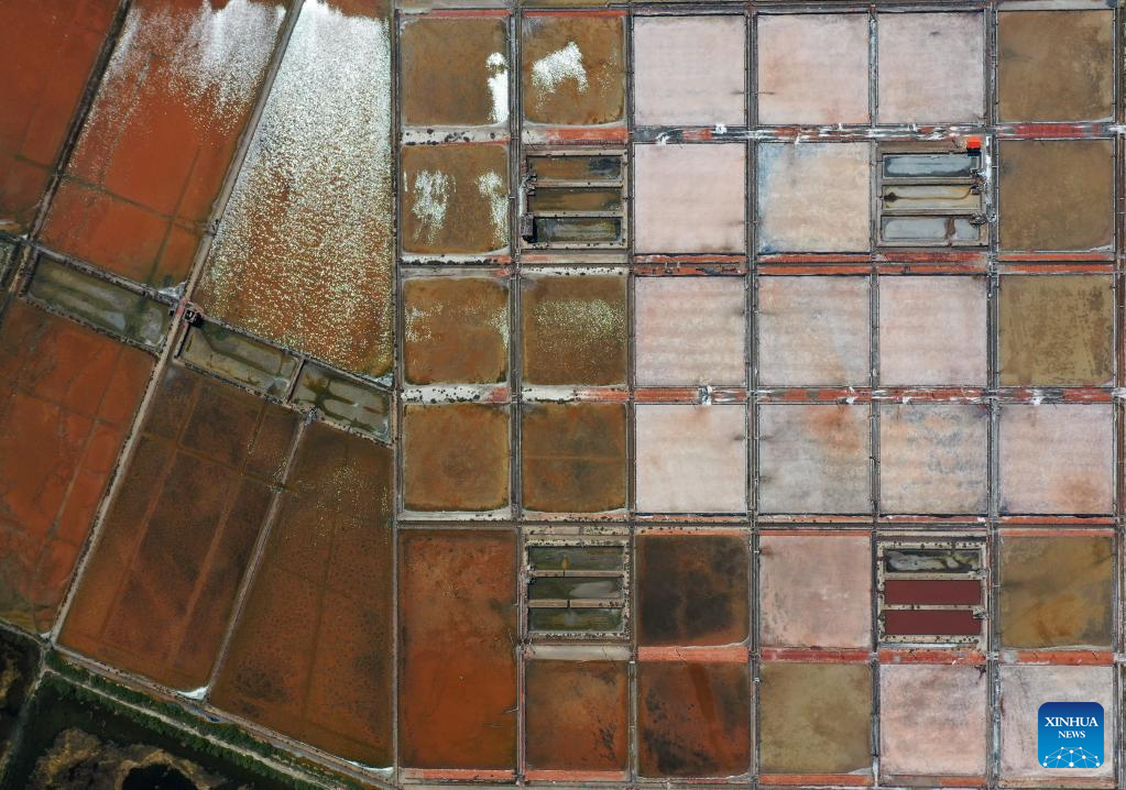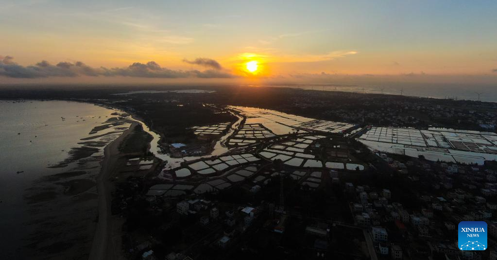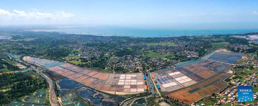 This aerial photo taken on May 28, 2023 shows the salt pans in Jiaowei Township of Xuwen County, Zhanjiang City, south China's Guangdong Province. Bordering the South China Sea on the east and the Beibu Gulf on the west and facing the Hainan Island to the south across the Qiongzhou Strait, Zhanjiang City in south China's Guangdong Province has the largest area of mangrove forest across the country and is an important base of aquatic products. In recent years, the city has put great emphasis on the development of green industries and marine economy. (Xinhua/Liang Xu)