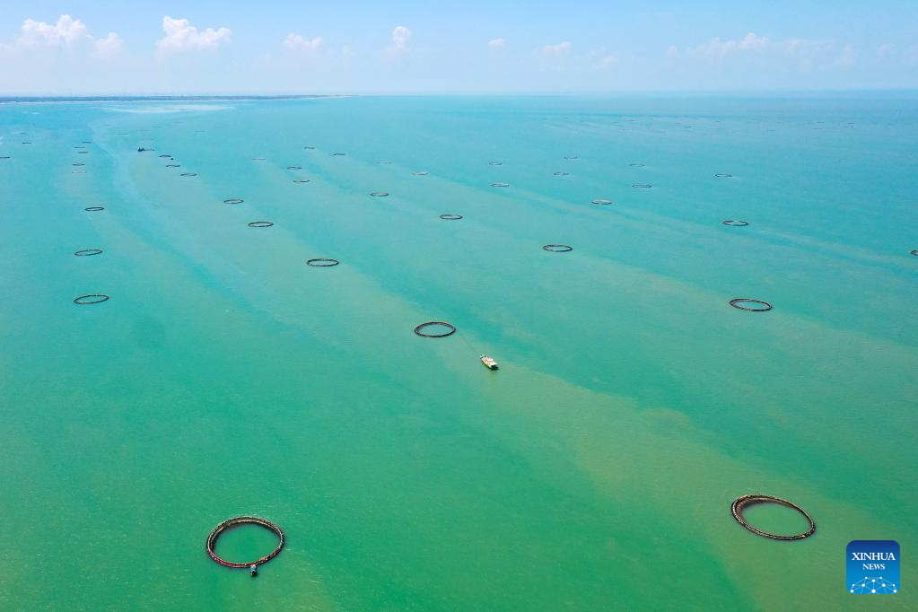 This aerial photo taken on May 27, 2023 shows the deep sea net cages for breeding golden pomfrets in Xilian Township of Xuwen County, Zhanjiang City, south China's Guangdong Province. Bordering the South China Sea on the east and the Beibu Gulf on the west and facing the Hainan Island to the south across the Qiongzhou Strait, Zhanjiang City in south China's Guangdong Province has the largest area of mangrove forest across the country and is an important base of aquatic products. In recent years, the city has put great emphasis on the development of green industries and marine economy. (Xinhua/Liu Dawei)