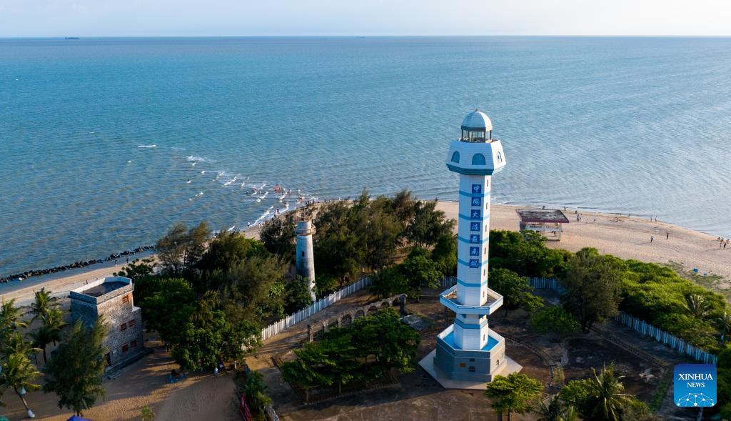 This aerial photo taken on May 27, 2023 shows the view of Deng Lou Corner in Jiaowei Township of Xuwen County, Zhanjiang City, south China's Guangdong Province. The Deng Lou Corner is named after the lighthouse situated on the ground and the pointed shape of the ground into the sea. Bordering the South China Sea on the east and the Beibu Gulf on the west and facing the Hainan Island to the south across the Qiongzhou Strait, Zhanjiang City in south China's Guangdong Province has the largest area of mangrove forest across the country and is an important base of aquatic products. In recent years, the city has put great emphasis on the development of green industries and marine economy. (Xinhua/Mao Siqian)