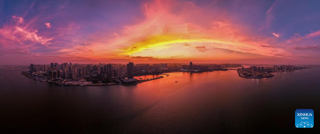 This aerial photo taken on May 27, 2023 shows the sunrise view taken in Jiaowei Township of Xuwen County, Zhanjiang City, south China's Guangdong Province. Bordering the South China Sea on the east and the Beibu Gulf on the west and facing the Hainan Island to the south across the Qiongzhou Strait, Zhanjiang City in south China's Guangdong Province has the largest area of mangrove forest across the country and is an important base of aquatic products. In recent years, the city has put great emphasis on the development of green industries and marine economy. (Xinhua/Deng Hua)