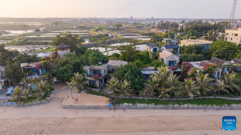 This aerial photo taken on May 28, 2023 shows the view of homestays in Jiaowei Town of Xuwen County, Zhanjiang City, south China's Guangdong Province. Bordering the South China Sea on the east and the Beibu Gulf on the west and facing the Hainan Island to the south across the Qiongzhou Strait, Zhanjiang City in south China's Guangdong Province has the largest area of mangrove forest across the country and is an important base of aquatic products. In recent years, the city has put great emphasis on the development of green industries and marine economy. (Xinhua/Mao Siqian)