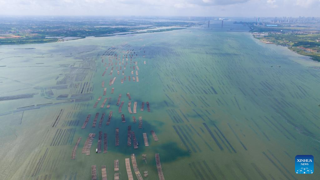 This aerial photo taken on May 26, 2023 shows an oyster breeding base in Guandu Township of Potou District, Zhanjiang City, south China's Guangdong Province. Bordering the South China Sea on the east and the Beibu Gulf on the west and facing the Hainan Island to the south across the Qiongzhou Strait, Zhanjiang City in south China's Guangdong Province has the largest area of mangrove forest across the country and is an important base of aquatic products. In recent years, the city has put great emphasis on the development of green industries and marine economy. (Xinhua/Mao Siqian)