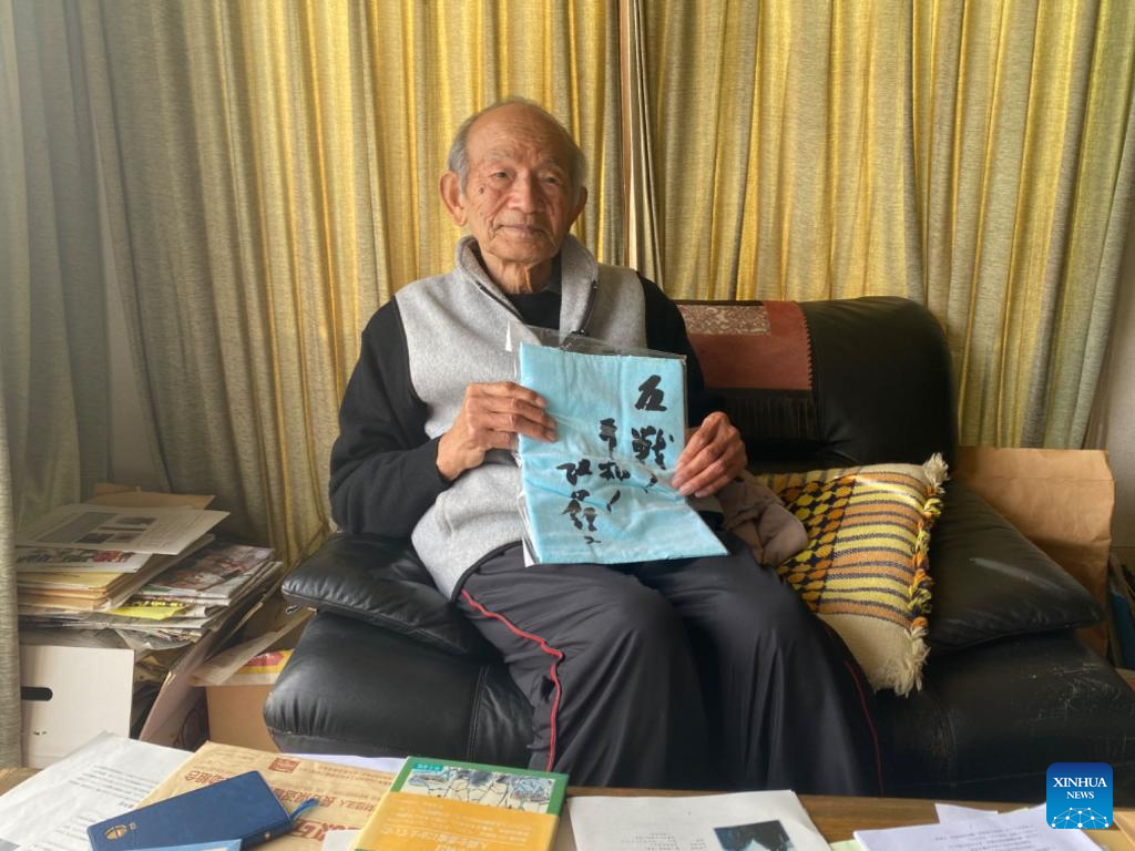 Noboru Kubota, former chairman of the Shinshu War Exhibition for Peace Organizing Committee and the Iida City Peace Material Collection Committee, receives an interview with Xinhua at home in Iida City, Japan, Jan. 13, 2023. (Xinhua/Guo Dan)