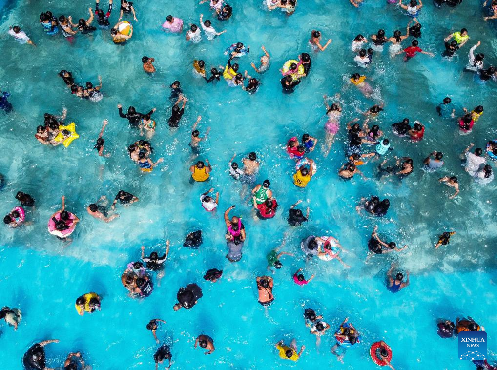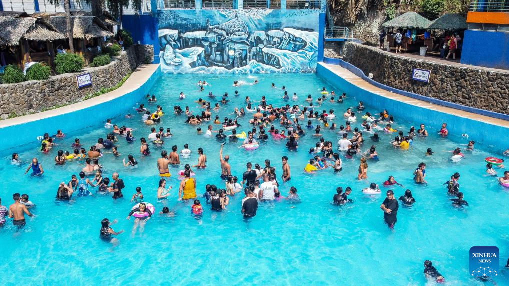An aerial drone photo taken on May 5, 2024 shows people cooling off in a swimming pool at a resort in Bulacan Province, the Philippines. People spend time at pools to cool off amid heatwave in the Philippines. (Xinhua/Rouelle Umali)
