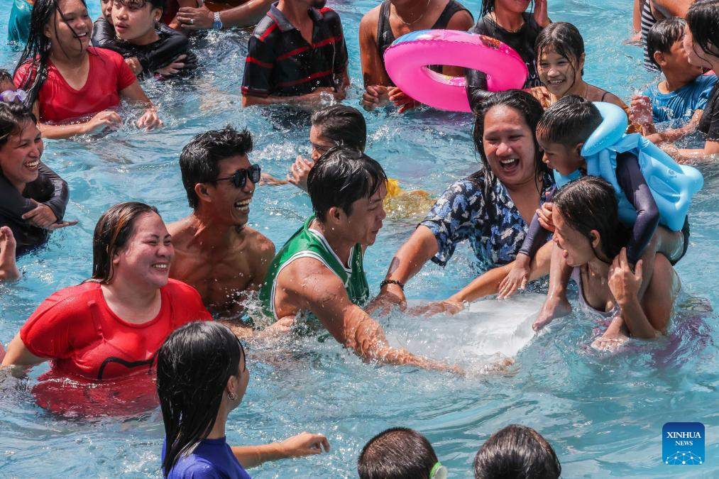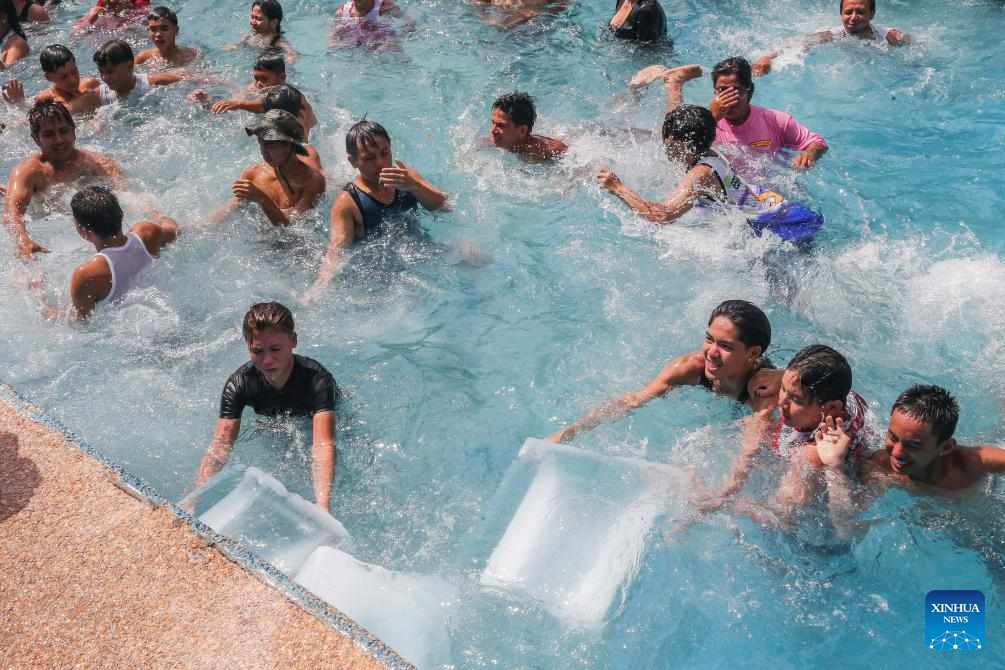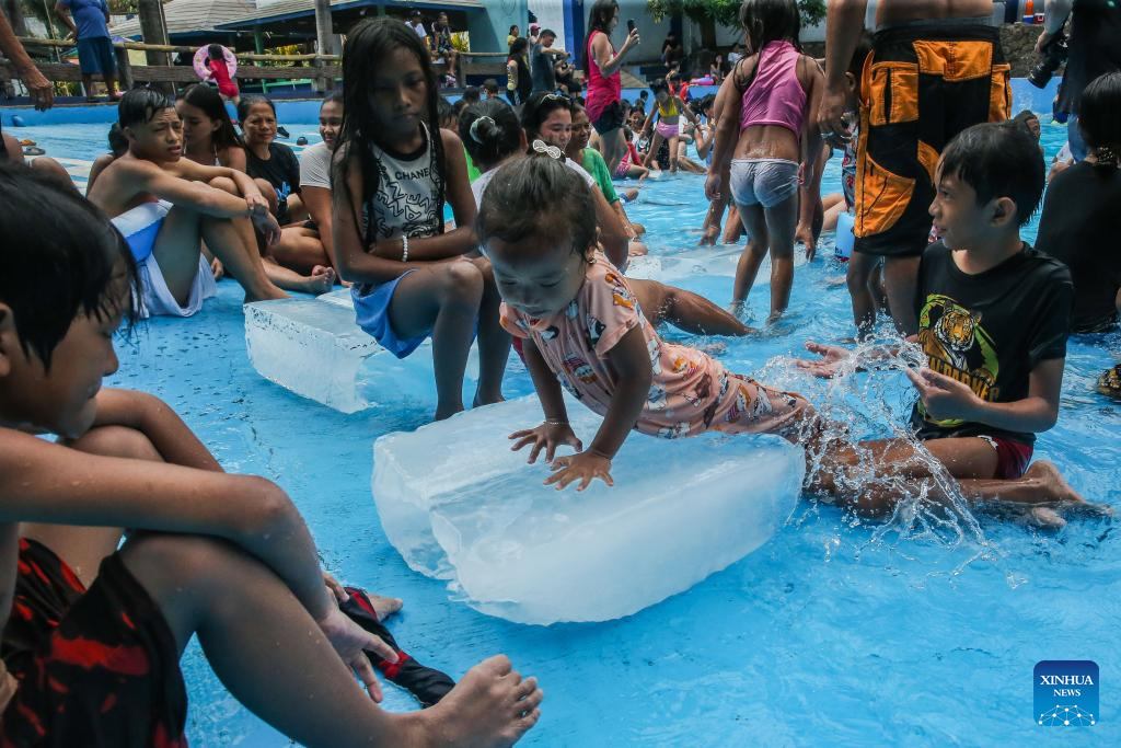 People cool off with ice blocks in a swimming pool at a resort in Bulacan Province, the Philippines, on May 5, 2024. People spend time at pools to cool off amid heatwave in the Philippines. (Xinhua/Rouelle Umali)