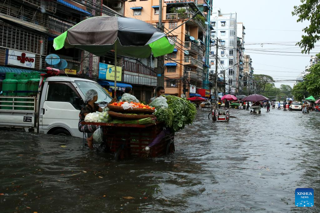 Vendors wait for customers at a flooded area after heavy rains in Yangon, Myanmar, May 11, 2024. (Photo by Myo Kyaw Soe/Xinhua)