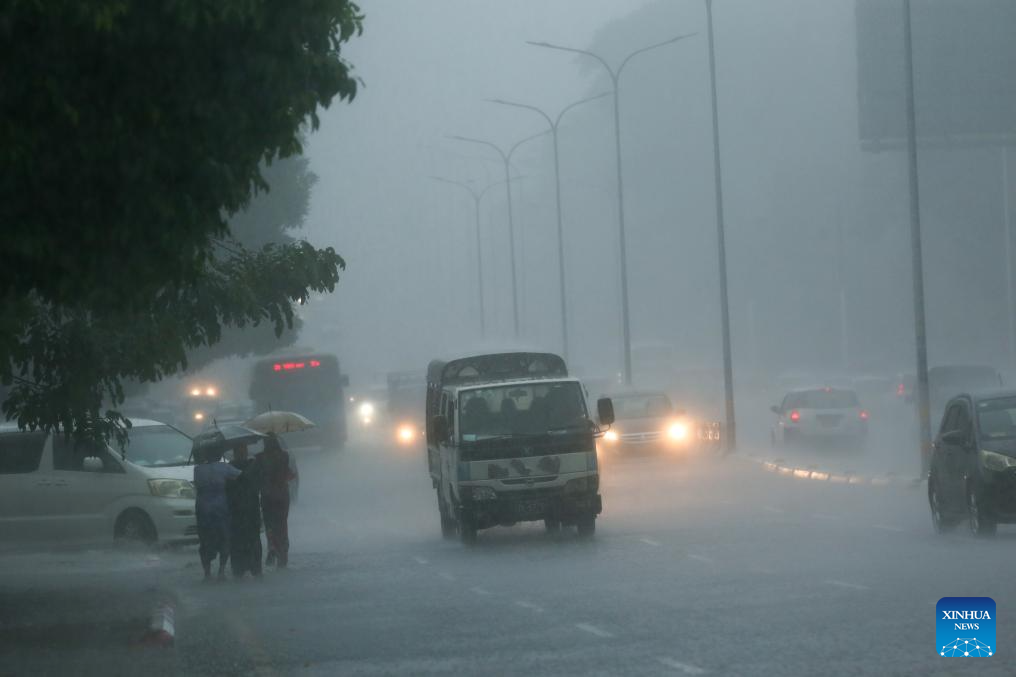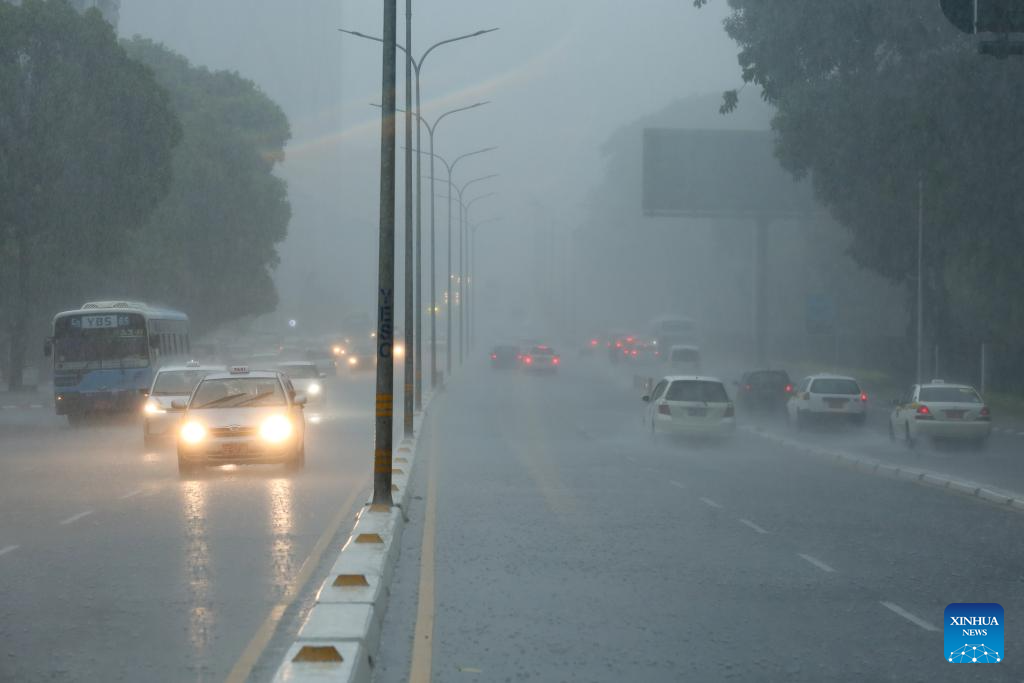 Vehicles run along a road amid heavy rain in Yangon, Myanmar, May 11, 2024. (Photo by Myo Kyaw Soe/Xinhua)