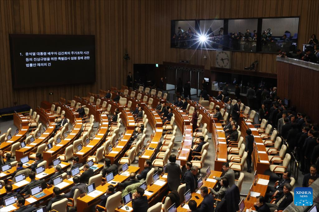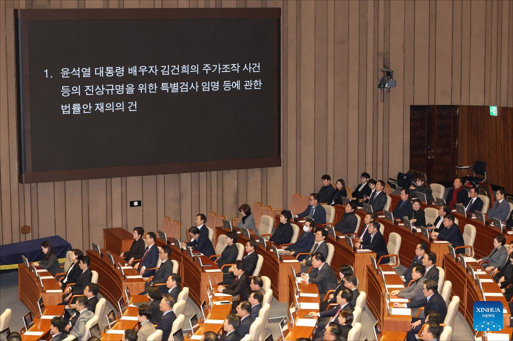 South Korea's National Assembly lawmakers vote on a bill to investigate scandals involving the first lady of President Yoon Suk-yeol in Seoul, South Korea, Dec. 7, 2024. Of 300 National Assembly lawmakers, 198 voted for the bill on the special prosecutor investigation of the first lady, with 102 against it. At least two-thirds of the lawmakers need to vote yes to pass the bill. (Xinhua)