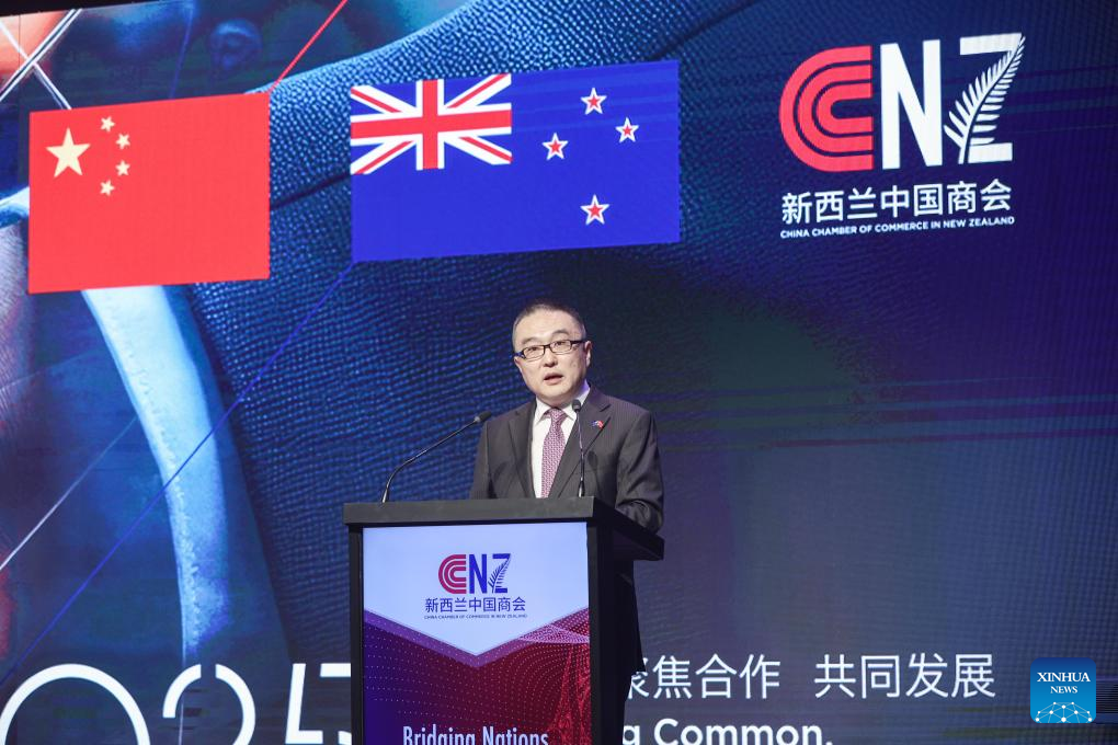 Chinese Ambassador to New Zealand Wang Xiaolong speaks at the "Vision 2025" business event held by the China Chamber of Commerce in New Zealand, in Auckland, New Zealand, Dec. 6, 2024. (Xinhua/Long Lei)