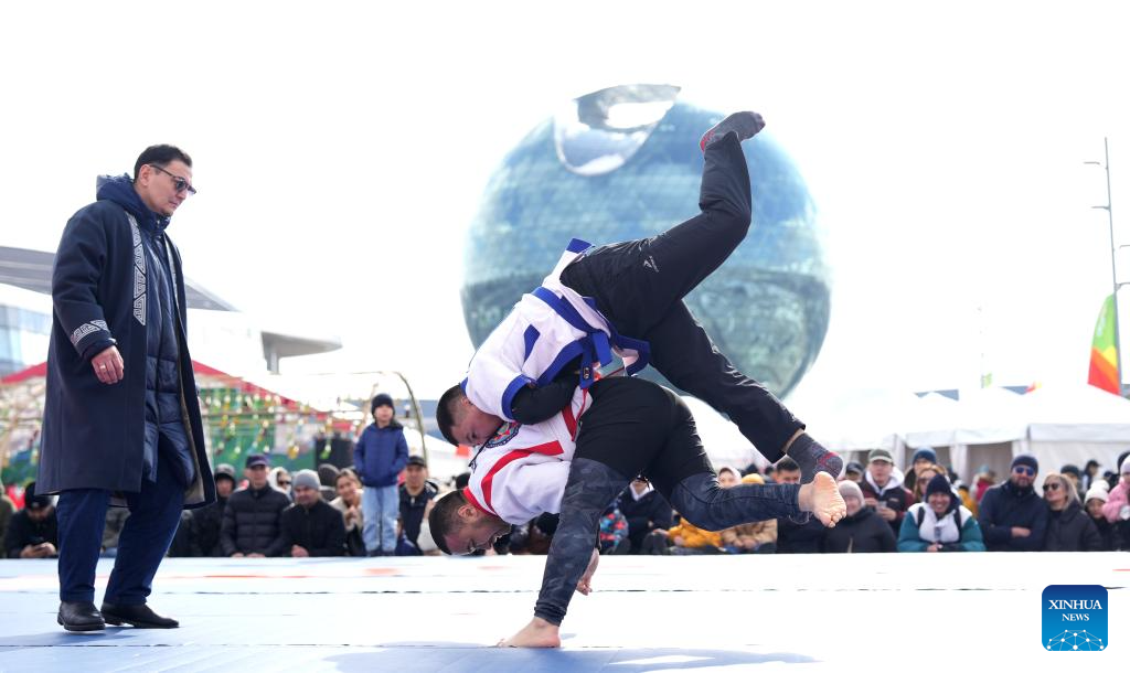 Citizens participate in wrestling on a square to celebrate the Nauryz festival in Astana, Kazakhstan, on March 21, 2025. People in Kazakhstan are enjoying a five-day holiday to celebrate Nauryz, the traditional New Year, from March 21 to 25. In Kazakh, "Nauryz" means "bidding farewell to the old and welcoming the new." (Photo by Kalizhan Ospanov/Xinhua)
