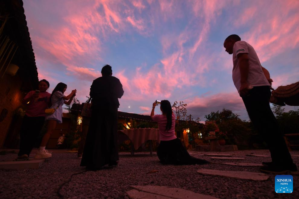 Tourists take photos during the twilight at Jilong Village, in Liujiang District, Liuzhou City, south China's Guangxi Zhuang Autonomous Region, Oct. 5, 2025. In recent years, Liujiang District of Liuzhou City has leveraged its thriving rural industries and vibrant agricultural economy to expand its tourism business. In the first three quarters of this year, Liujiang District received a total of 5.9975 million visits, a year-on-year increase of 11.16 percent, with tourism-related revenue of 6.006 billion yuan (850.26 million U.S. dollars), up 9.91 percent compared to the same period last year. (Xinhua/Huang Xiaobang)