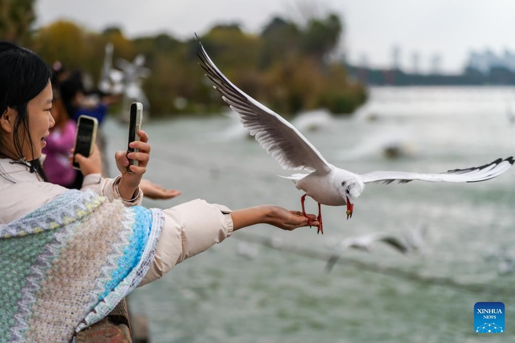 A tourist feeds black-headed gulls at a wetland park by the Dianchi Lake in Kunming, southwest China's Yunnan Province, on Dec. 11, 2025. (Xinhua/Peng Yikai)