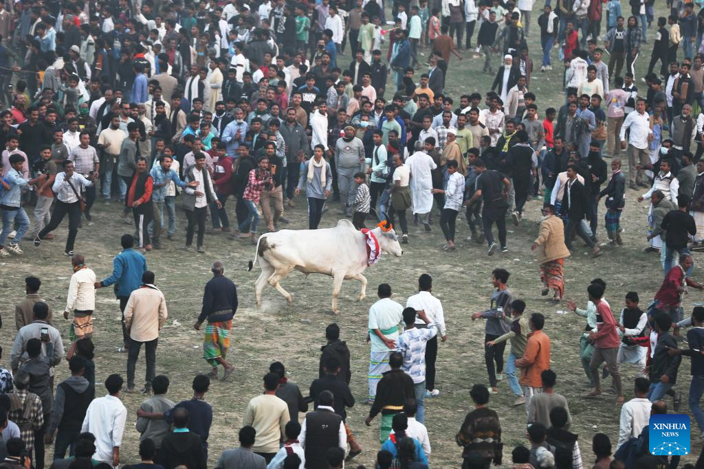 People and a cow participate in a traditional rural bull race in Dohar Upazila, on the outskirts of Dhaka, Bangladesh, Jan. 23, 2026. Traditional bull races are popular in the area and have generated great excitement among local audiences. (Photo by Habibur Rahman/Xinhua)