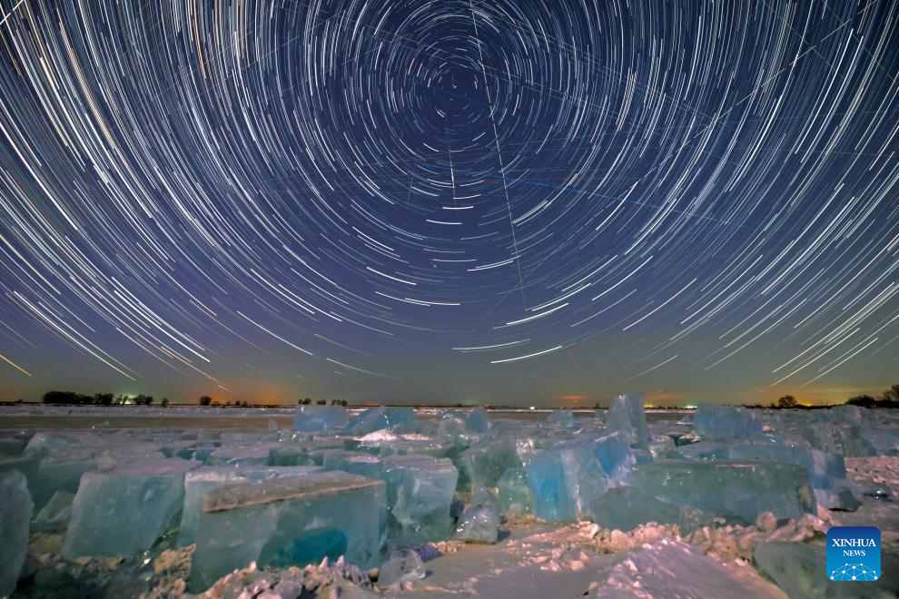 This stack composite photo taken on Jan. 25, 2026 shows a view of the starry sky in Jiamusi City, northeast China's Heilongjiang Province. China's northernmost Heilongjiang Province has entered the golden period for winter starry sky observation. With auroras occasionally making an appearance, the brilliant starry sky and the icy landscape together unfold a serene and breathtaking picture. (Photo by Zhu Zongqiang/Xinhua)