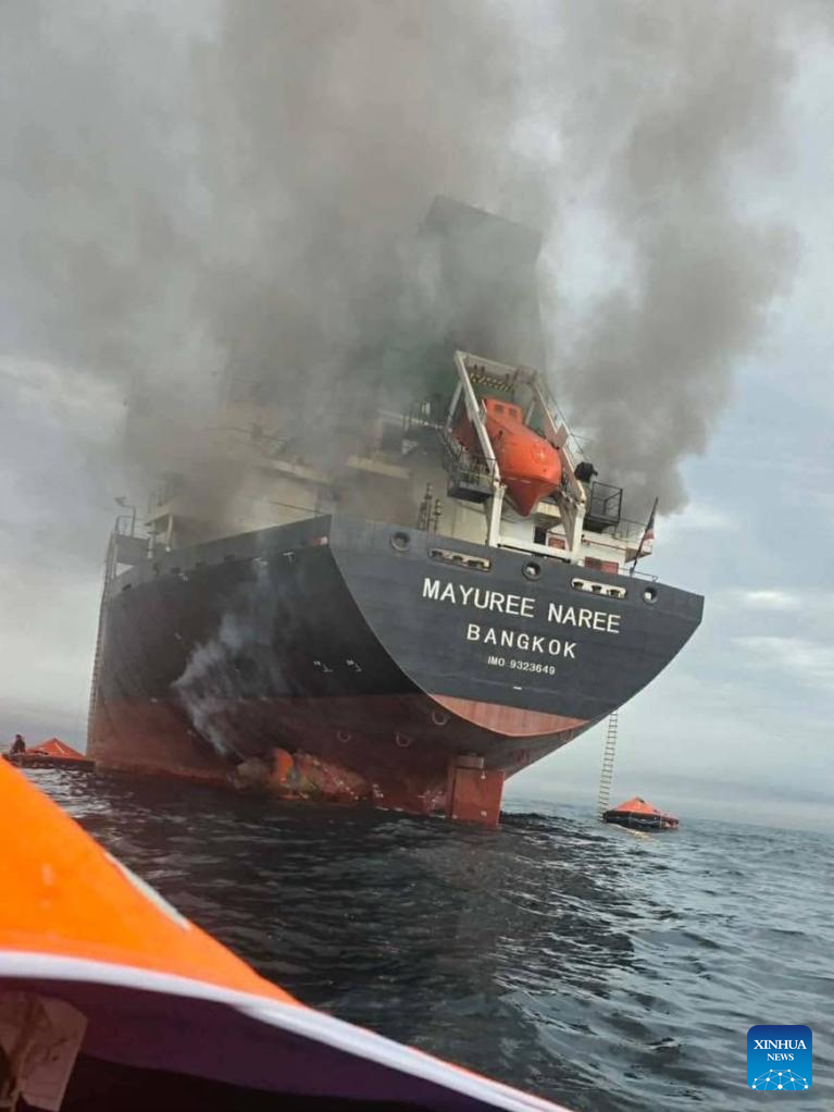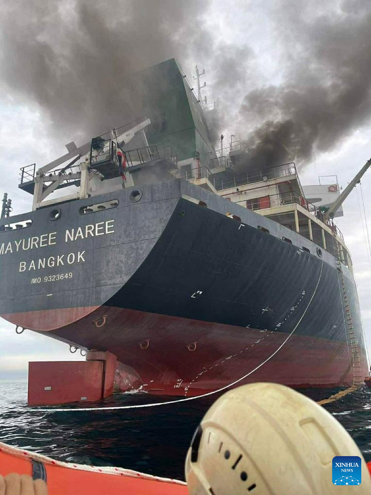 A fire breaks out on a Thai cargo ship after it was struck in the Strait of Hormuz on March 11, 2026. A Thai cargo ship came under attack on Wednesday while sailing in the Strait of Hormuz, said the Royal Thai Navy. So far, 20 crew members have been rescued and taken to Oman for settlement. (Royal Thai Navy/Handout via Xinhua)