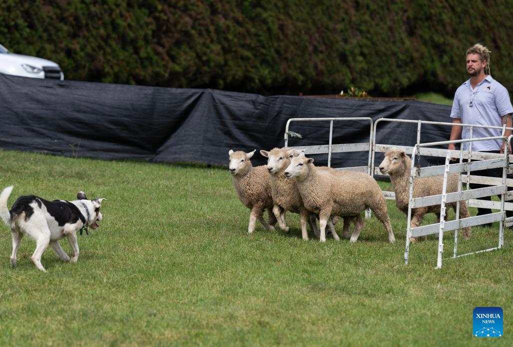 This photo taken on March 14, 2026 shows a sheep dog trial during the Kumeu show in Auckland, New Zealand. (Photo by Wu Jiaxiang/Xinhua)