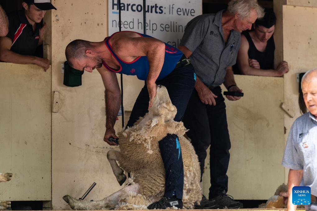 This photo taken on March 14, 2026 shows a sheep shearing competition during the Kumeu show in Auckland, New Zealand. (Photo by Wu Jiaxiang/Xinhua)