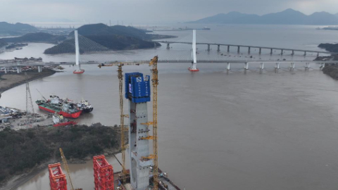 Concrete pouring operation for crossbeam on east main tower of Fuchimen road-rail bridge completed in China's Zhejiang