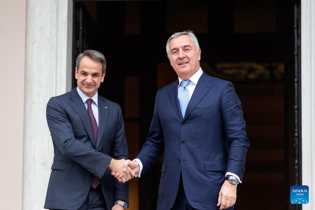 Greek Prime Minister Kyriakos Mitsotakis (L) welcomes Montenegrin President Milo Djukanovic in Athens, Greece, on Feb. 8, 2022. Montenegro expects Greece's continued support for its accession to the European Union (EU), visiting Montenegrin President Milo Djukanovic said here on Tuesday. (Xinhua/Marios Lolos)