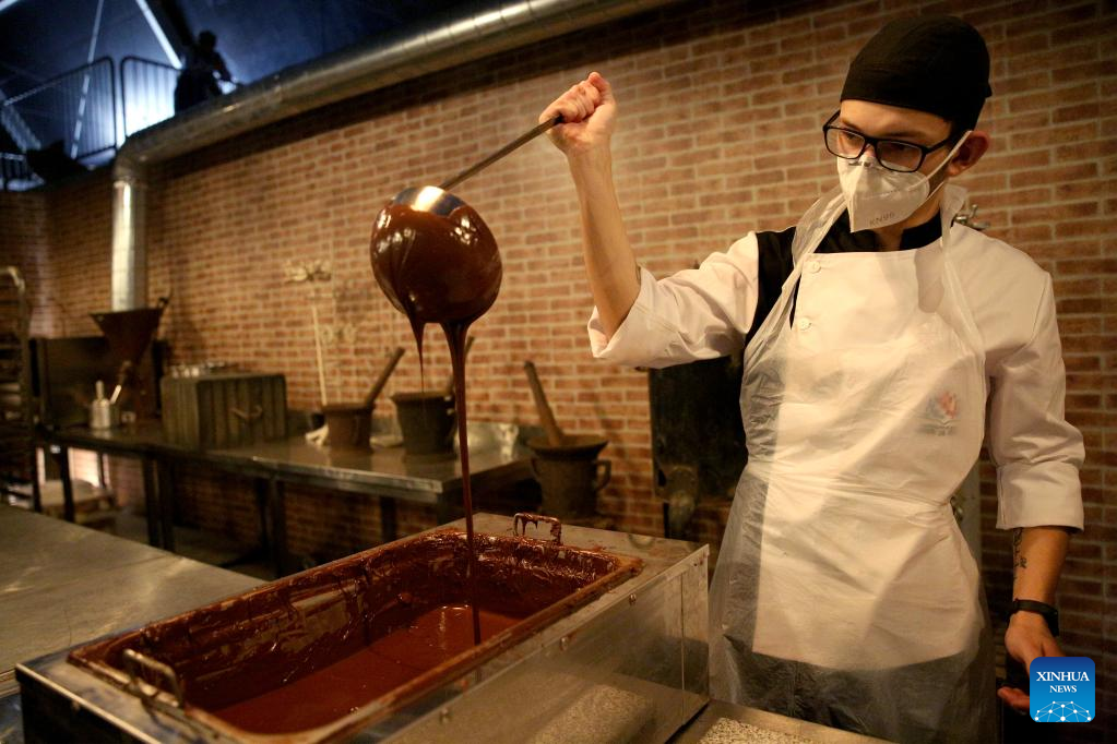 A pastry chef prepares chocolate during the 2022 Obidos International Chocolate Festival in Obidos, Portugal, on March 26, 2022. (Photo by Pedro Fiuza/Xinhua)