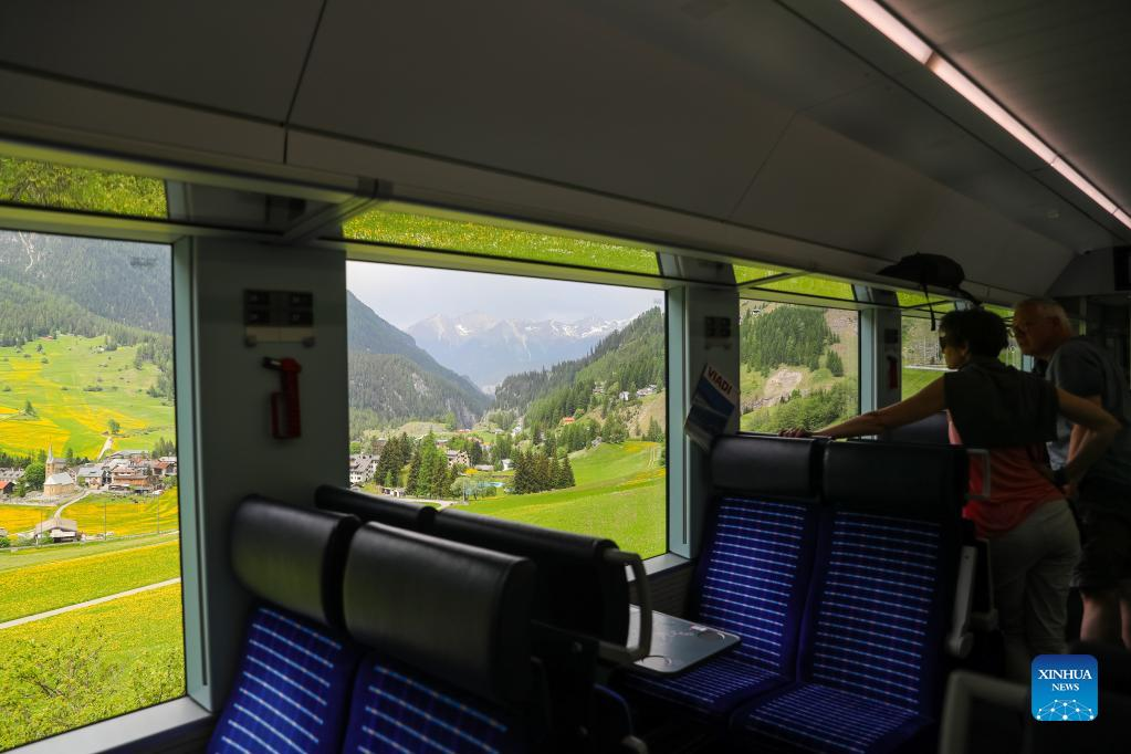 Passengers look at the view on a train that runs on the Rhaetian Railway in the Albula/Bernina landscapes in Switzerland, May 22, 2022. The Rhaetian Railway in the Albula/Bernina landscapes was included in the UNESCO World Heritage List in 2008. (Xinhua/Zheng Huansong)