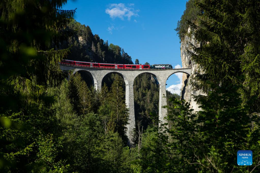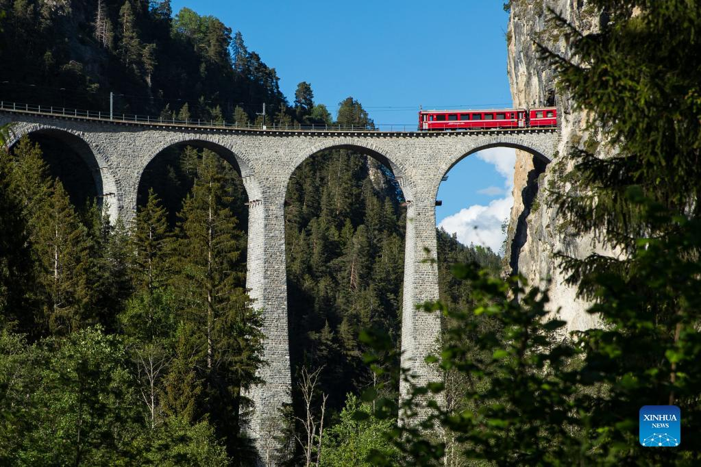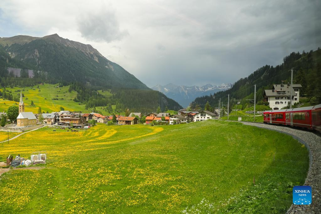 A train runs on the Rhaetian Railway in the Albula/Bernina landscapes in Switzerland, May 26, 2022. The Rhaetian Railway in the Albula/Bernina landscapes was included in the UNESCO World Heritage List in 2008. (Xinhua/Zheng Huansong)
