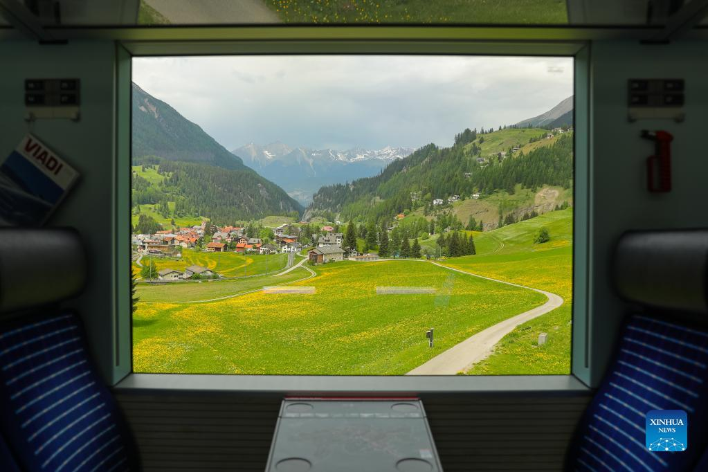 Photo taken on May 22, 2022 shows a view through the window on a train that runs on the Rhaetian Railway in the Albula/Bernina landscapes in Switzerland. The Rhaetian Railway in the Albula/Bernina landscapes was included in the UNESCO World Heritage List in 2008. (Xinhua/Zheng Huansong)