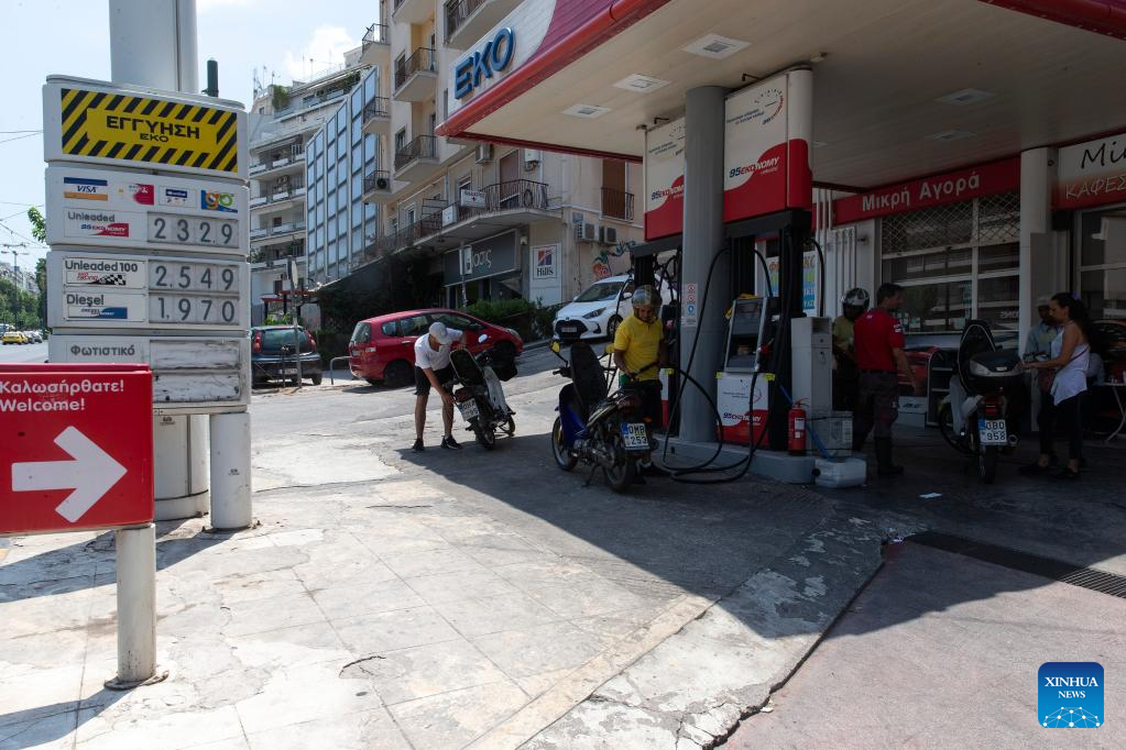 A man fuels a motorcycle at a gas station in Athens, Greece, on July 8, 2022. (Xinhua/Marios Lolos)