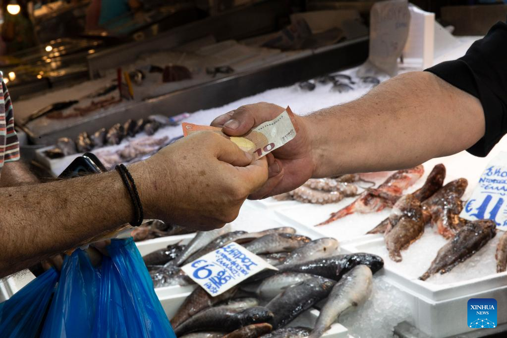 A customer buys fish at a market in Athens, Greece, on July 8, 2022. (Xinhua/Marios Lolos)