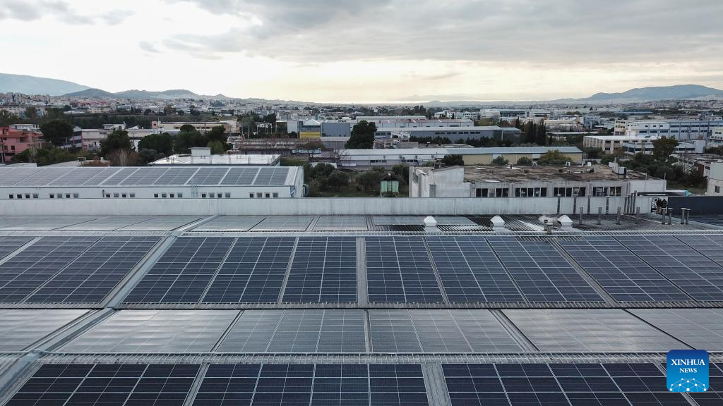This photo taken on Nov. 29, 2022 shows photovoltaic installations at the rooftop of Stergiou Family S.A. factory in Acharnes, a suburb of Athens, Greece. Facing soaring electricity and natural gas bills, Greek companies and households are turning to photovoltaics en masse this year to cope with the ongoing energy crisis.(Photo by Lefteris Partsalis/Xinhua)