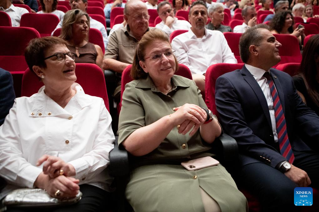 Greek Culture and Sports Minister Lina Mendoni (C) watches the performance of China's TAO Dance Theater in Kalamata, Greece, on July 14, 2023. (Photo by Panagiotis Moschandreou/Xinhua)