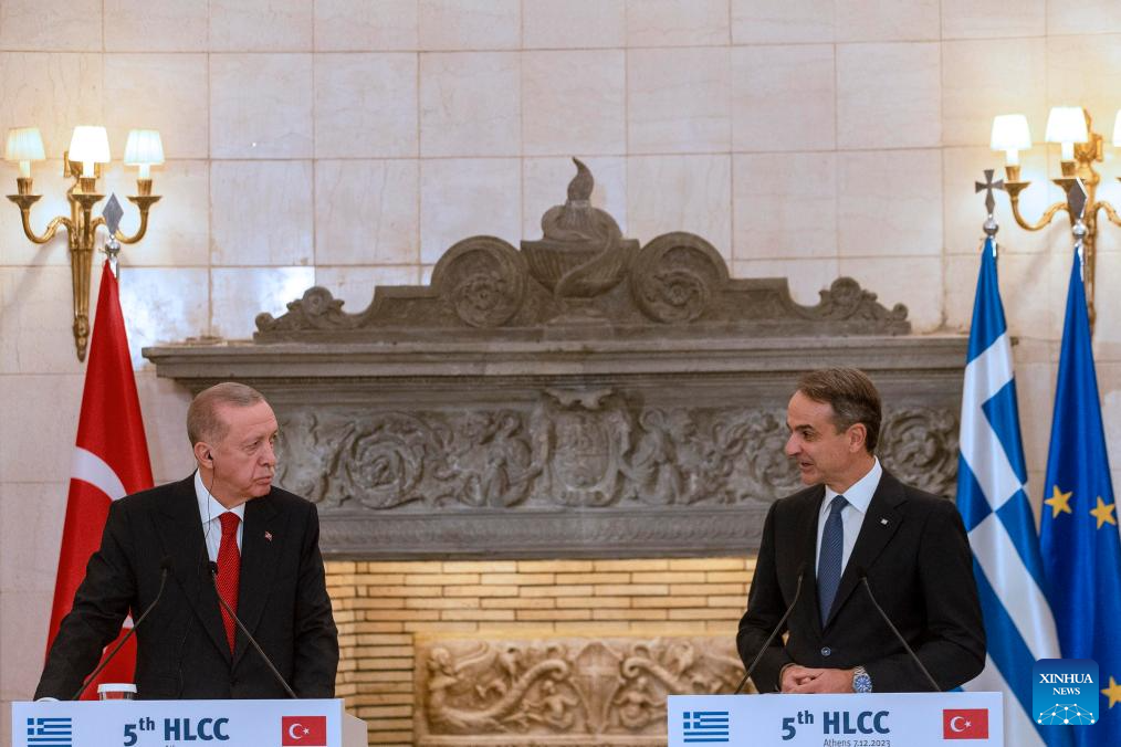 ATHENS, Dec. 7 (Xinhua) -- Greece and Türkiye pledged to strengthen cooperation during Turkish President Recep Tayyip Erdogan's visit to Athens on Thursday.